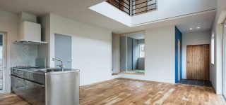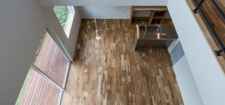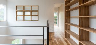 家の中心に大胆な吹き抜けのあるO邸。その南側の壁面に設けた大きな開口部からは、溢れるほどの光が注ぎ、隣地に広がる果樹園や、夜には星までも眺めることができます。吹き抜け部分の天井高は5mを超え、実際のサイズ以上に広々と感じられる1階は、奥に寄せたキッチンから全体を見渡せる配置。ゲストルームを兼ねた畳の小上がりも含め、人が集まる場所としても実に心地良いしつらえです。2階は吹き抜けを囲むように書斎、図書館のような書棚、浴室や洗面所などの水回り、模様ガラスの飾り窓がある寝室が配置されています。各所に施された優美なディテールもさることながら、自分たちのライフスタイルを明瞭にイメージして必要な要素を機能的に配置することにより、つくり込みと全体性の均衡が取れた知性を感じる家となりました。[ 2015年10月竣工、写真:東涌写真事務所 ]